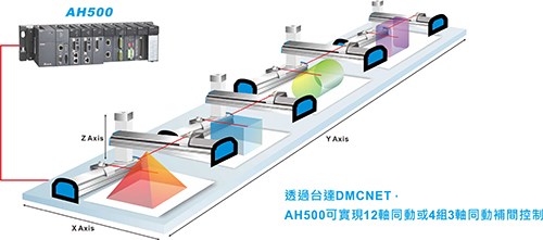 AH500的優(yōu)異運動控制功能,可實現任意三軸直線補間、任意兩軸圓弧補間、及任意三軸螺旋補間與連續(xù)補間功能,透過臺達DMCNET高速通訊網絡架構,可達到1ms的指令周期內12軸同動或4組3軸同動補間功能。無論是復雜的過程控制或是精密的運動控制需求,都能透過AH500來實現,有效應用于各種產業(yè)機臺,如建材機,經編機,食品包裝機等等。